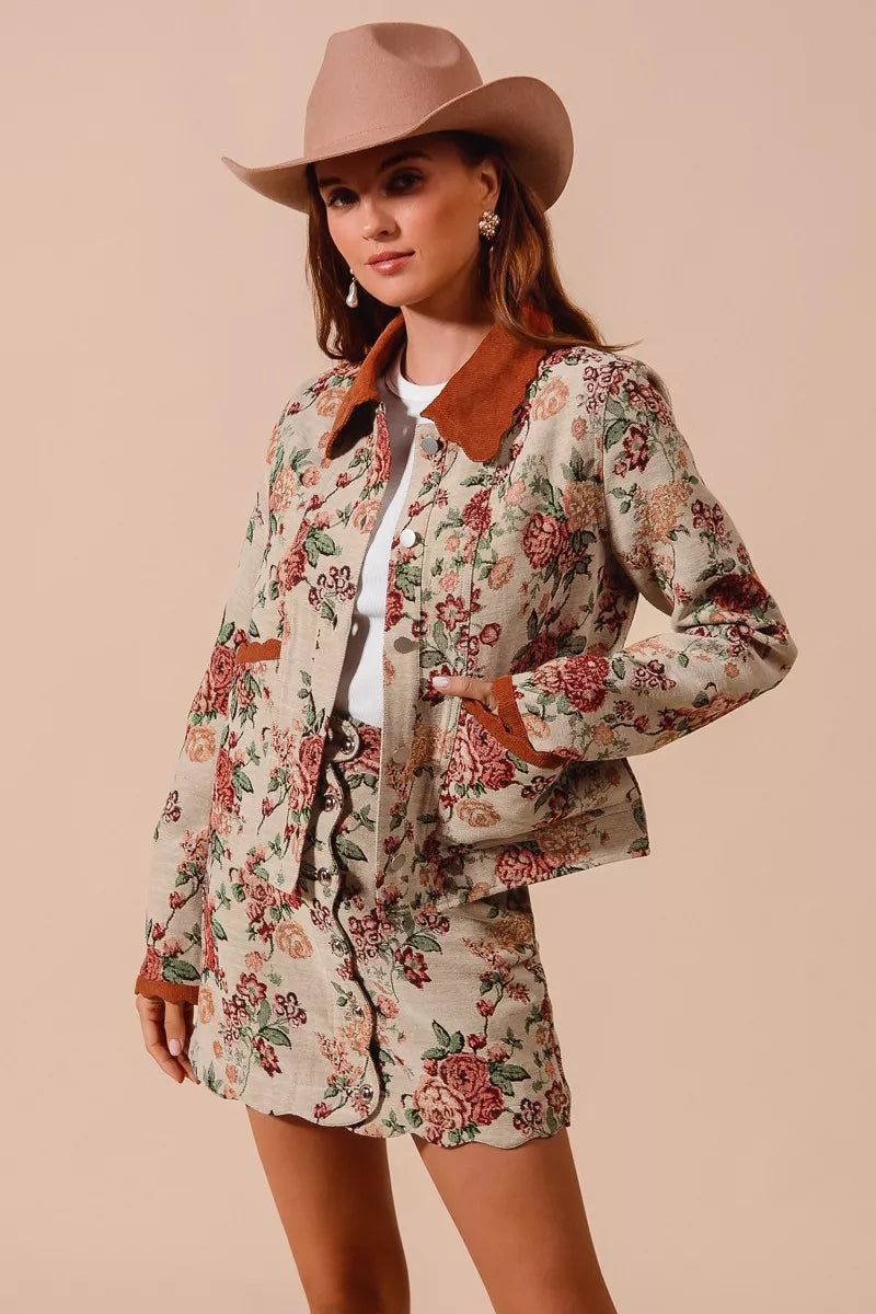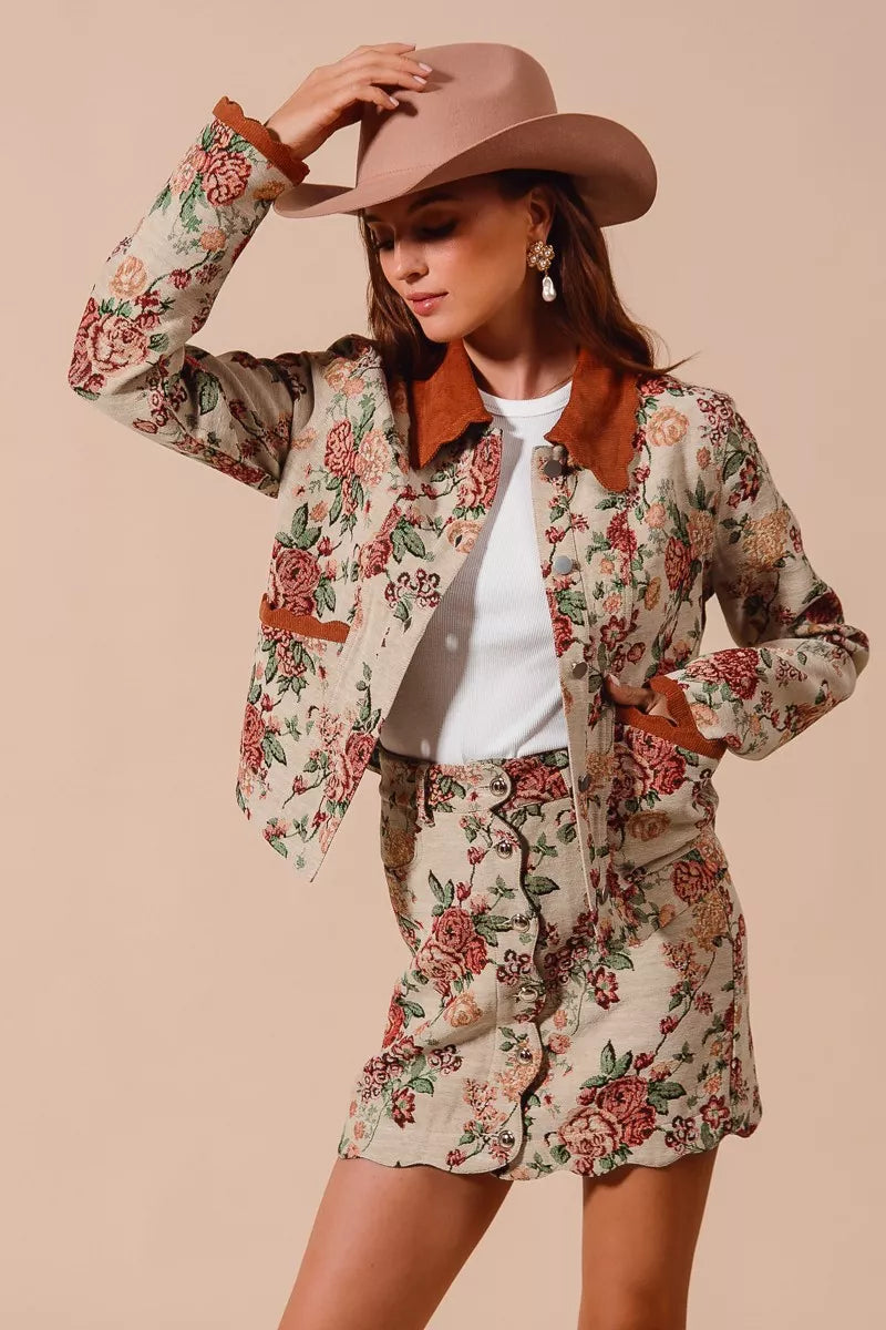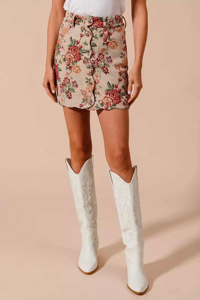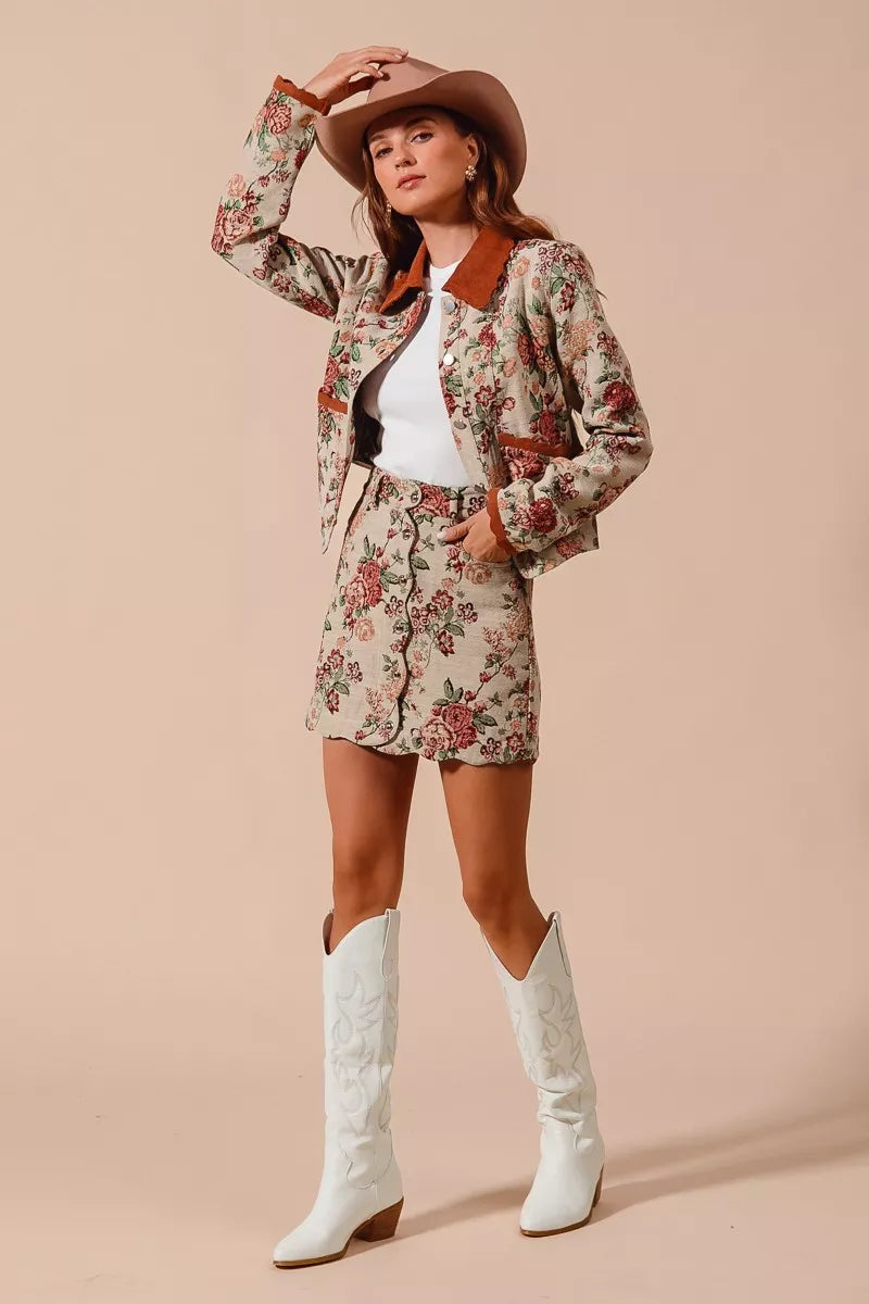 This mini skirt features a beautiful floral jacquard pattern and a button front design for a chic and stylish look. The floral jacquard adds a touch of elegance and texture to the skirt, making it a versatile piece for various occasions. The button front detail adds a classic and trendy element, enhancing the overall design. The scalloped hem provides a charming and feminine touch, adding a unique flair to the skirt. Elevate your outfit with this Floral Jacquard Button Front Mini Skirt With Scalloped Hem for a polished and fashionable ensemble.