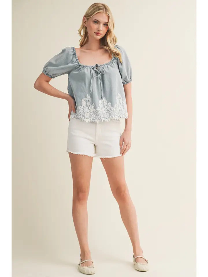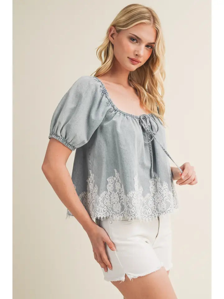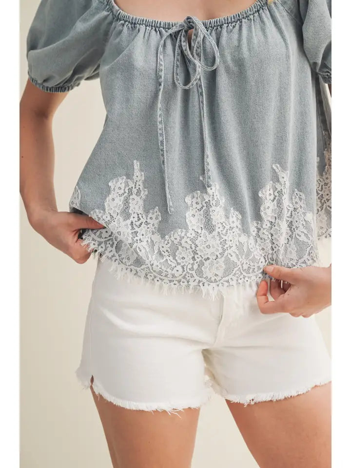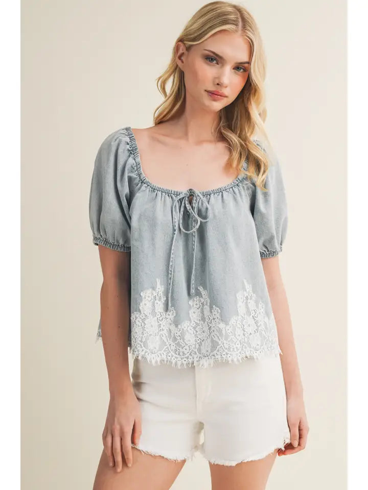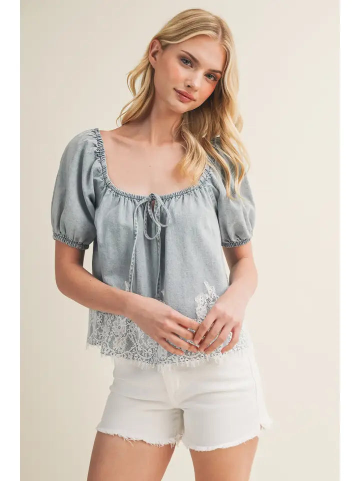 Perfect for pairing with high-waisted jeans, denim shorts, or a flowing midi skirt, this top transitions seamlessly from casual daytime looks to date-night ready. The combination of structured denim and soft lace creates a beautiful contrast that's both modern and timeless — a boutique favorite for the romantic at heart.