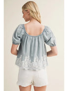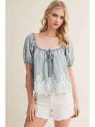 Sweet, feminine, and effortlessly charming, The Romantic Lace Denim Top is your new warm-weather favorite. Featuring a flattering square neckline trimmed with delicate lace detail and romantic puff sleeves, this denim top brings vintage-inspired elegance to any outfit. The front tie detail adds a playful touch, while the soft cotton-blend denim provides comfortable, breathable wear for all-day style.