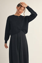 Cozy meets elevated in The Solace Knot Sweater. Designed with a relaxed drop shoulder and a soft, textured knit, this sweater brings effortless sophistication to your fall wardrobe. The subtle front knot accent adds shape and style, making it perfect for pairing with high-waisted bottoms or layered over our matching Solace Midi Dress for a modern, feminine look.