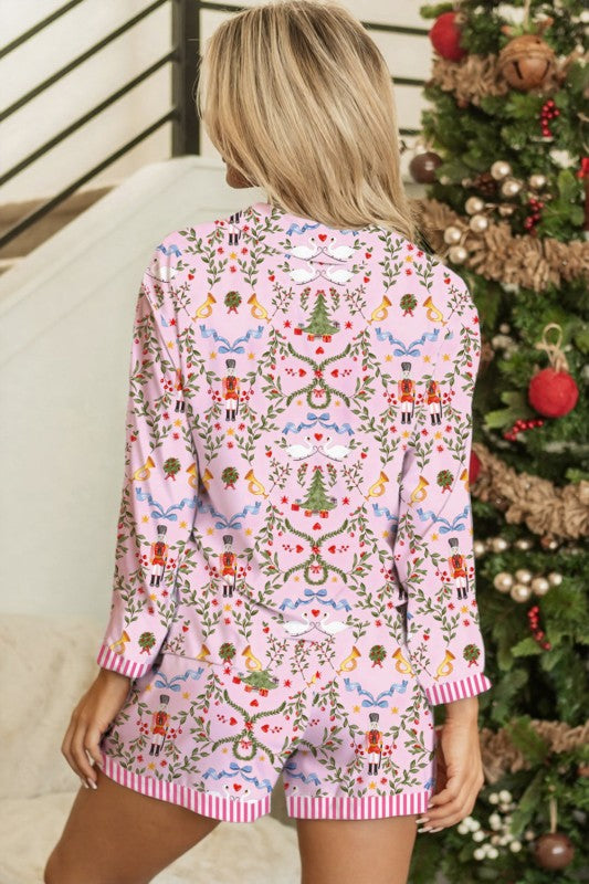Get ready to sleigh in style with this delightful nutcracker-themed pajama duo! Featuring a cheerful pink Christmas print, this two-piece set pairs a cozy long sleeve top with matching shorts for the ultimate holiday comfort. Crafted from soft, breathable fabric that feels amazing against your skin, you'll stay snug and comfortable from bedtime through morning. Perfect for creating those picture-perfect family pajama moments during the festive season! 100% Viscose