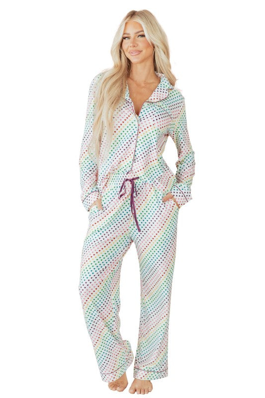 Snuggle up in style with this adorable white two-piece pajama set, complete with an all-over heart print that screams romance. Crafted from premium soft fabric, the long sleeves keep you toasty through the night while the coordinated top-and-bottom design makes a picture-perfect couple's look. Whether you're celebrating Valentine's Day, marking an anniversary, or simply want to add some love-filled comfort to your bedtime routine, this charming set transforms ordinary nights into special occasions worth remembering. Polyester/Spandex