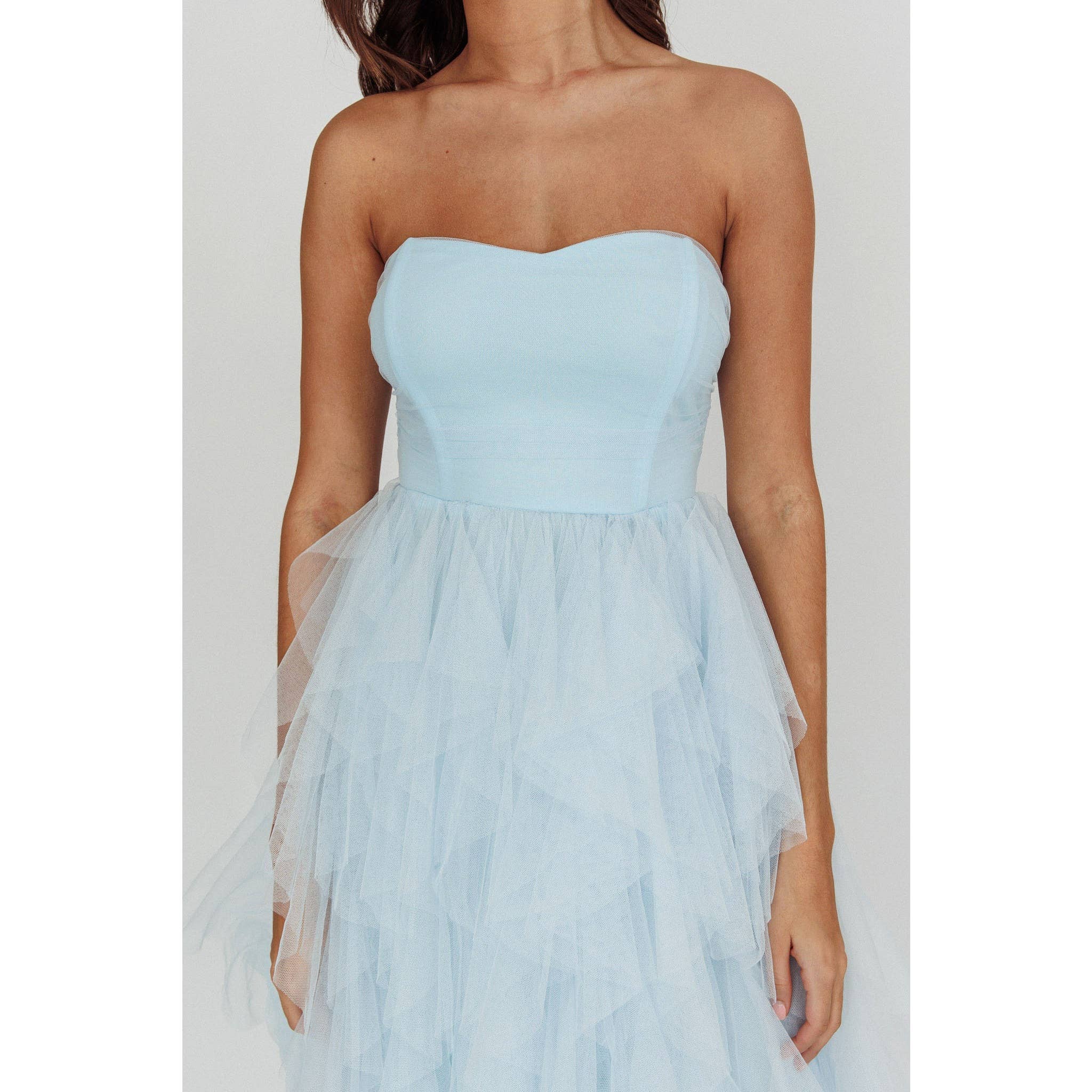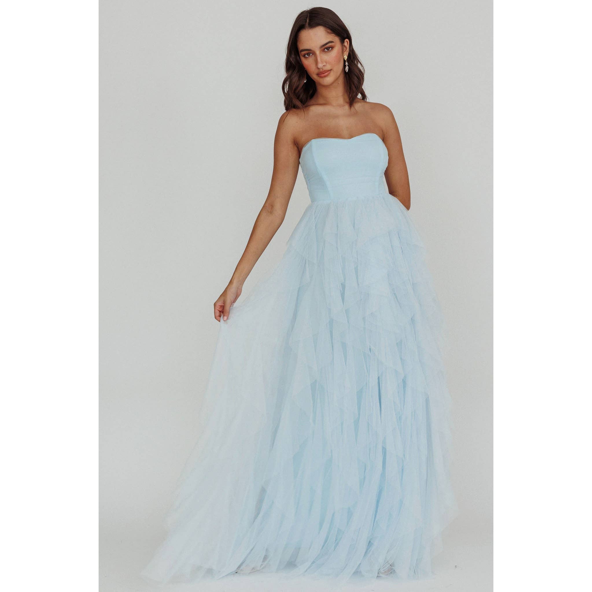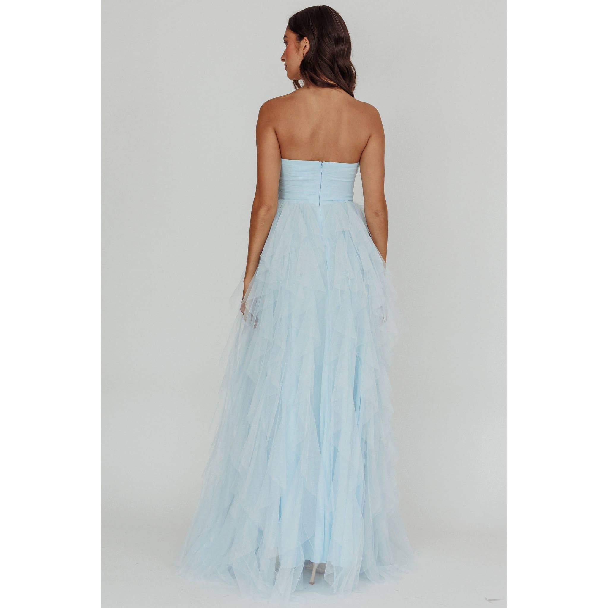 This stunning strapless tulle gown in a delicate light blue hue is the perfect choice for any formal occasion, whether it's a prom, wedding, or gala. The dress features a beautifully designed bodice with boning that provides excellent support and structure, ensuring you feel confident and comfortable all night long. The cascading tulle mesh flows gracefully down to a maxi length, creating an ethereal silhouette that will make you feel like a princess. The soft light blue color adds a touch of elegance and charm, making it a versatile option that pairs well with various accessories. With its exquisite craftsmanship and flattering fit, this gown is sure to turn heads and leave a lasting impression wherever you go.