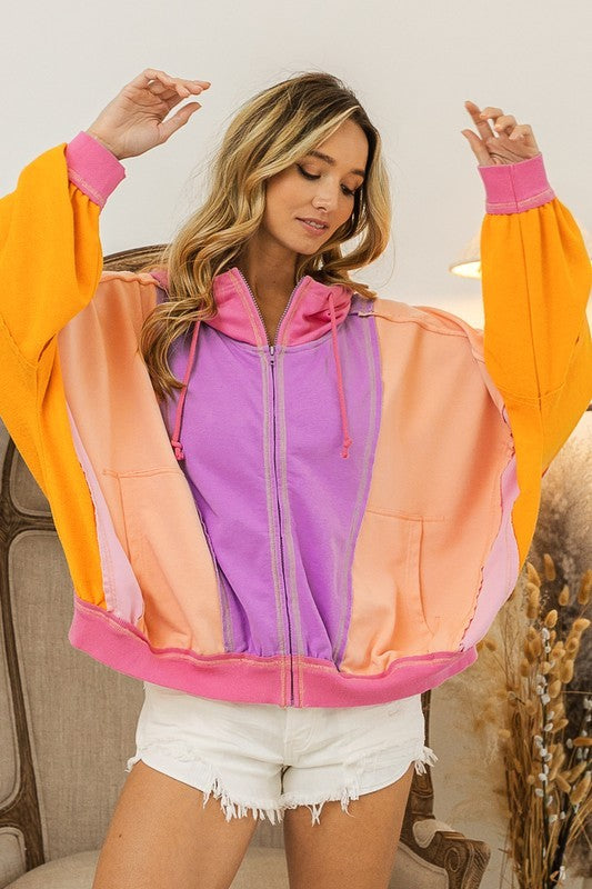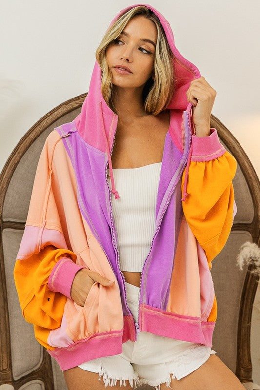 Introducing the ultimate fashion statement for your casual wardrobe: the color block hoodie in a stunning pink hue! This oversized hoodie features a unique raw edge and a vintage washed French terry fabric that gives it a stylish, worn-in look while maintaining a contemporary edge. With long sleeves and a drawstring hood, it not only provides warmth but also adds a trendy flair to any outfit. The full zipper and mock neck design ensure practicality, making it perfect for layering on those chilly days. Plus, the inclusion of pockets adds functionality, allowing you to keep your essentials close at hand. The super soft fabric with stretch guarantees all-day comfort and flexibility, making it an ideal choice for lounging at home or heading out with friends. Available in vibrant, colorful options, this hoodie is a must-have for anyone looking to elevate their casual style!