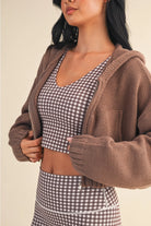 Cozy meets cool in The Mocha Mood Zip Hoodie. This cropped sweatshirt is the ultimate laid-back essential, designed in a rich mocha hue that pairs effortlessly with everything. Made from soft, mid-weight fabric, it features a front zipper closure, relaxed hood, and ribbed cuffs for a classic yet elevated touch.