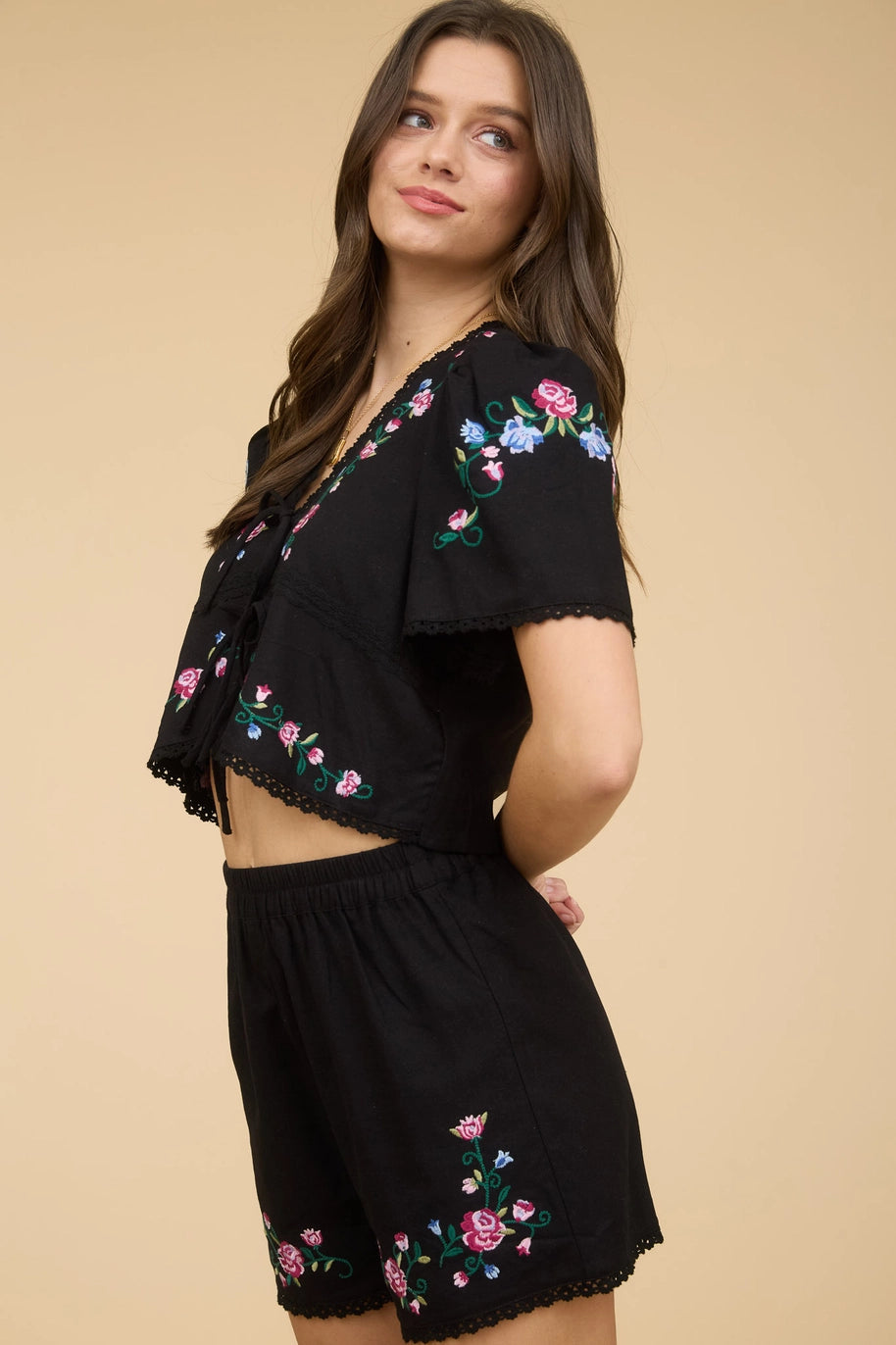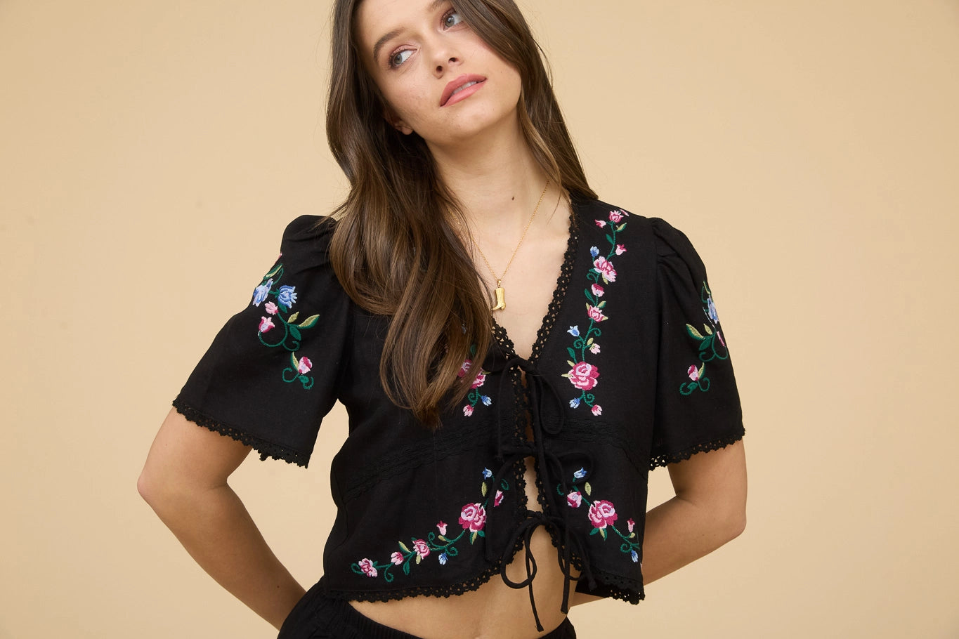 The Rosette Tie Embroidered Top brings vintage romance to modern styling. Crafted from a breathable black cotton-blend fabric, this cropped blouse features vibrant floral embroidery in pink, blue, and green tones, delicately framing the neckline and sleeves. The scalloped hem and lace trim add a feminine finish, while the dual front tie closures let you customize your fit with ease. With puffed short sleeves and a flattering v-neckline, this top is perfect for everything from brunch to festivals.