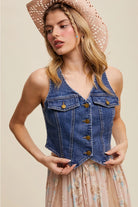 Bring timeless western flair to your wardrobe with the Vintage Denim Vest. Crafted from soft stretch denim, this piece offers a structured yet comfortable fit that flatters your shape. Designed with classic button-front closure, antique brass-style hardware, and pointed flap details at the chest, it captures the spirit of vintage Americana. The pointed hemline and adjustable back buckle finish the look with tailored charm, making it an effortless layering piece for dresses, skirts, or your favorite jeans. Perfect for country concerts, festivals, or everyday western-inspired style.