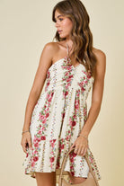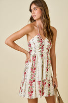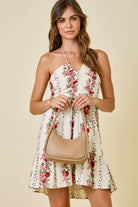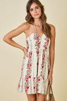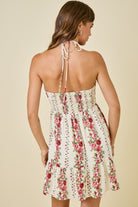 Turn heads and steal hearts in the Blossom Breeze mini dress. Your new go-to for brunch dates, garden parties, and warm sunset strolls. This flirty, feminine mini dress features a soft floral print that dances with every step, with a flattering halter neckline that ties delicately at the neck for a customizable fit. The smocked back hugs you comfortably while the playful ruffle hem adds just the right touch of flirt. Fully lined for effortless wear. Just slip it on and feel instantly pretty