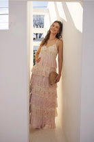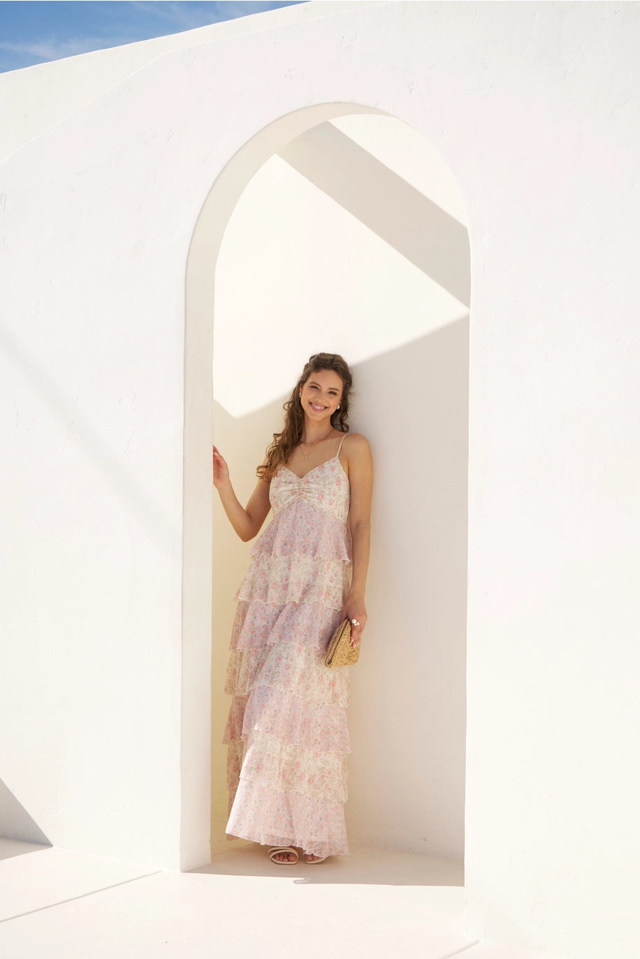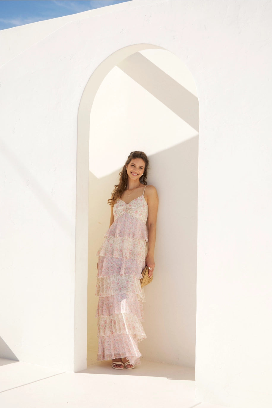 Whether you're walking across the stage or celebrating under the stars, the Midnight Garden Ruffle Maxi is the answer to your 'what do I wear?' dilemma. Perfectly curated for graduation pictures and summer wedding guest style, this ethereal floral chiffon gown combines a flattering ruched bust with cascading ruffles for a look that photographs beautifully from every angle