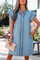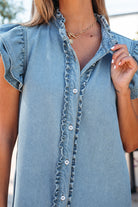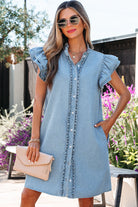 Meet your new throw-on-and-go favorite. This frilled denim mini dress blends effortless comfort with feminine charm, making it perfect for everyday wear. The soft chambray-style denim features delicate frilled trim and ruffled short sleeves for a flattering, graceful look that feels anything but basic.