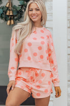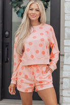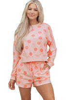 Meet your new favorite throw-on-and-go lounge look. The Sweet Spot Polka Dot Lounge Set features a relaxed pullover sweatshirt paired with comfy drawstring shorts for effortless everyday style. Designed with an allover polka dot print, this matching set delivers playful charm with a laid-back feel.